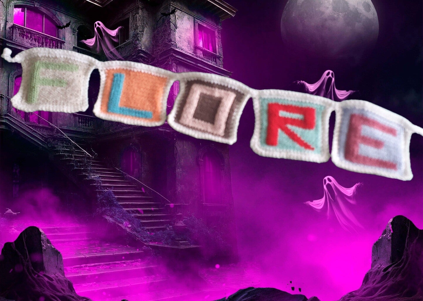 Suspension murale "FLORE" chaque lettre a une couleur différente faite main 100% acrylique au dimension d'environ 70 cm x 12 cm