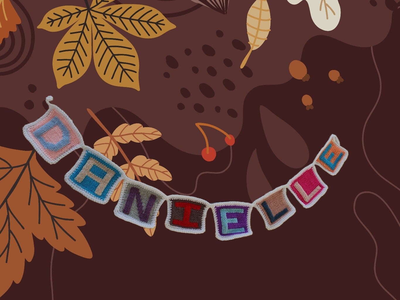 Chaque lettre est soigneusement tricotée puis brodée, avec des couleurs harmonieuses pour créer une décoration chaleureuse et personnalisée.